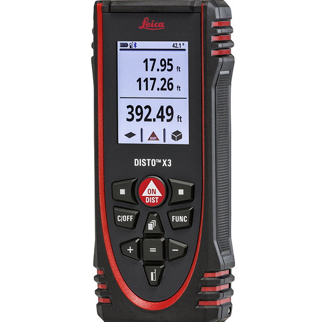 A DISTO that’s perfect for tough construction sites. The DISTO X3 has the same rugged design as the e7400x—IP65, drop tested at 2 meters—and it has a rotatable display which makes taking awkward measurements easier and more ergonomic. It also has a greater range of 490’ (150m), so it can go the distance. It’s got brawn and brains, too. The X3 is a tough DISTO, but it’s also smart. It includes our Smart Horizontal feature with an onboard tilt sensor so you can measure over and around obstacles. It also has Bluetooth so you can transfer your measurements to your computer or tablet—and you can use it with the DISTO Plan App for iOS and Android. The DISTO X3 has a bright, colorized, backlit display for taking measurements in all kinds of lighting conditions, ranging from dark indoor measurements in a basement to bright outdoor measurements. The X3 is our first DISTO that is compatible with the DST 360, a smart tripod and adapter set that extends the measurement possibilities of your X3. With the DST 360, your X3 turns into a professional measurement station—you can take point-to-point (P2P) measurements from one location. When used with the DST 360, the X3 can combine rotation, angle, and distance data to produce highly accurate Point-to-Point (P2P) measurements, which allows you to accurately measure distances between any two points from a third position. Use the DISTO Plan App to access Sketch, Document, and Smart Room features to create detailed CAD-ready floor and wall plans, including doors and windows. Export your plans as .DXF or .DWG files.